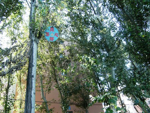 九月三日下午两点多钟,我和同修再一次出去挂真相条幅时,特意随身带了一个相机。我把那个象脸盆大的真相圆盘高挂在一棵树上的一根显眼的树枝上之后,拿出相机来拍照。当我把相机镜头对准圆盘时,我一下子惊呆了:圆盘上的“真善忍好”变成了一个大卍字符,圆盘周围都是小卍字符,一个接一个,正转,反转,金光闪闪,越来越亮,把原本灰蒙蒙的树的背景都转亮了,光芒四射……太神奇!太殊胜!太震撼了!我缓过神来喊同修,“你快过来看哪,字变成卍字符了, 太好看了!”同修正忙着挂另一条幅,没来得及看到镜头中的景象。我看见有两个人走了过来,就急忙按下了相机的快门。照片上呈现的是我们做的真实的圆盘的影像:绿色的底儿,红色的字,上端是“真”,左边是“善”,右面是“忍”,下方是“好”,端端正正的字,圆圆满满的盘,高高的镶嵌在枝叶繁茂的树上,真好看!