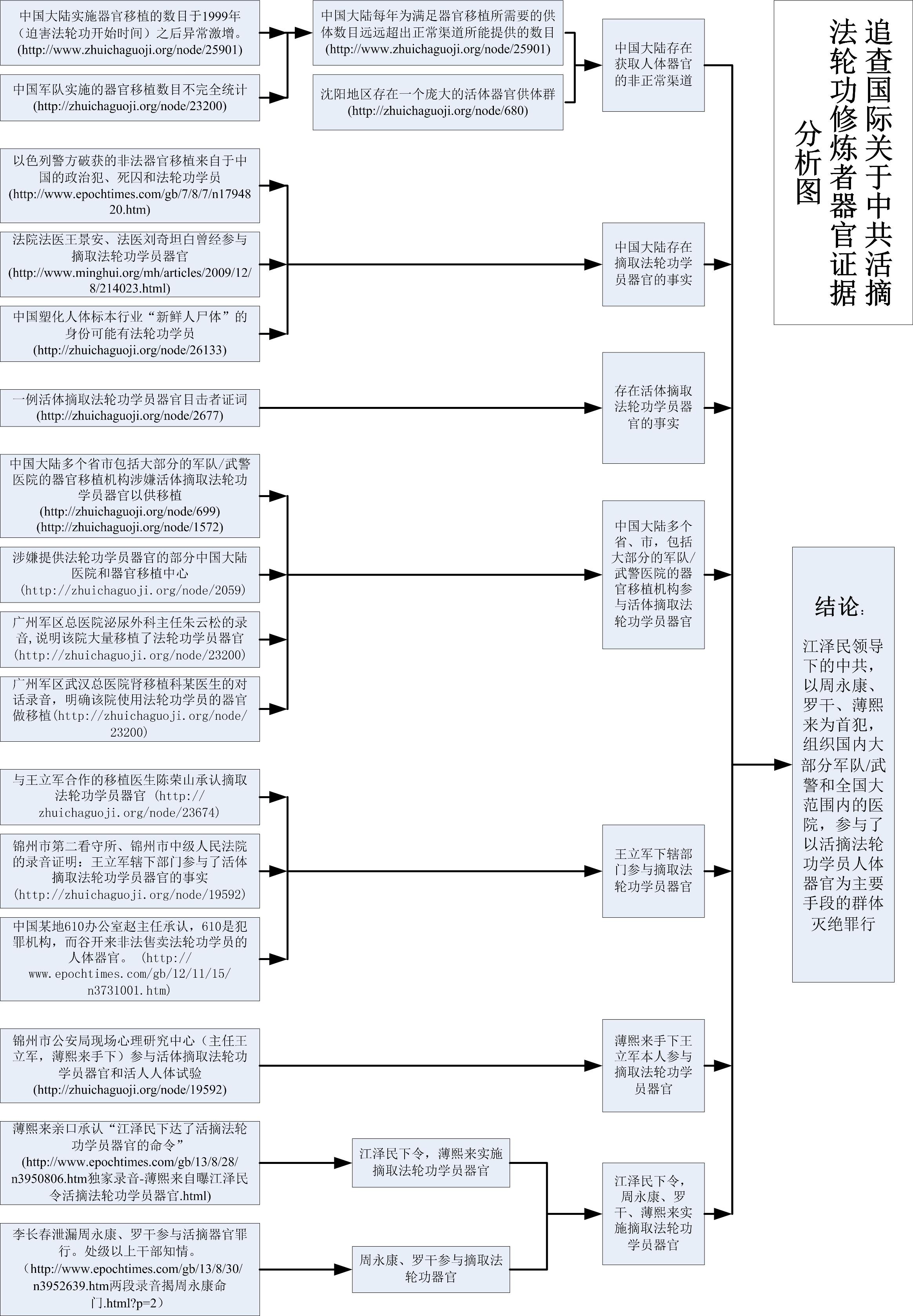 2006年3月9日以来,追查国际针对中国大陆30个省、直辖市、自治区的中共司法系统和军队、武警、地方等医院器官移植部门进行了持续的调查,获取了大量的证据。这些证据证实了中共活体摘取法轮功学员器官及做活人人体实验的罪恶是真实存在的。