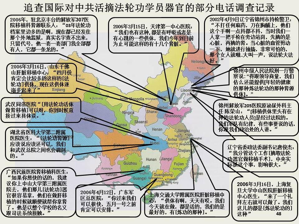 本组织获得证据可以证明,涉嫌参与犯罪的至少有23个省市自治区相关医院和器官移植中心:北京、天津、上海、河北、河南、山东、辽宁、吉林、黑龙江、安徽、湖南、湖北,江苏、浙江、广州、广西、福建、四川、云南、贵州、陕西、甘肃、新疆等。