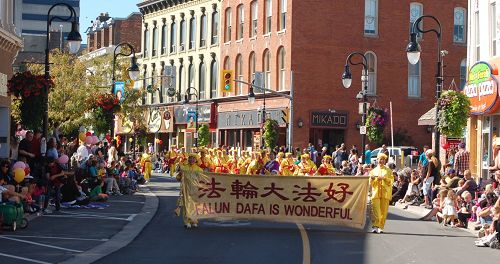 圣•卡瑟琳市居民Sue从观众席上走进游行队伍里,问跟在队伍旁边的记者:“他们来自哪里?什么是‘法轮大法’?他们的演奏和表演真的太棒了,我非常喜欢。”当接过传单后,她兴奋地说:“我一定要上网了解这个给我印象深刻的团体。感谢他们的到来。”