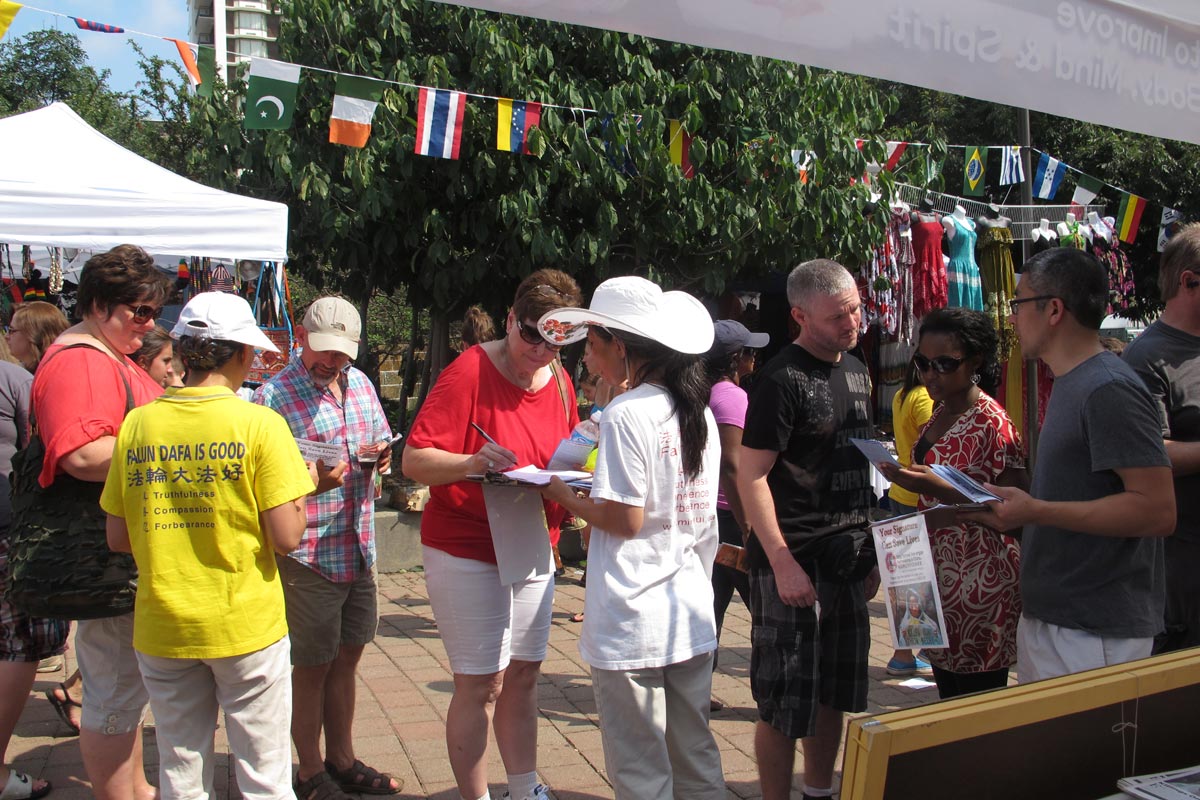许多民众为中共活摘法轮功学员器官的血腥暴行而震惊,毫不犹豫地签名谴责。有很多人表示对活摘器官有所耳闻,展板周围常常围满了了解真相的人们,来签名的人络绎不绝。许多民众留下签名后还急切地询问“我如何才能帮助?”并拿取了一些资料准备发给身边的人。