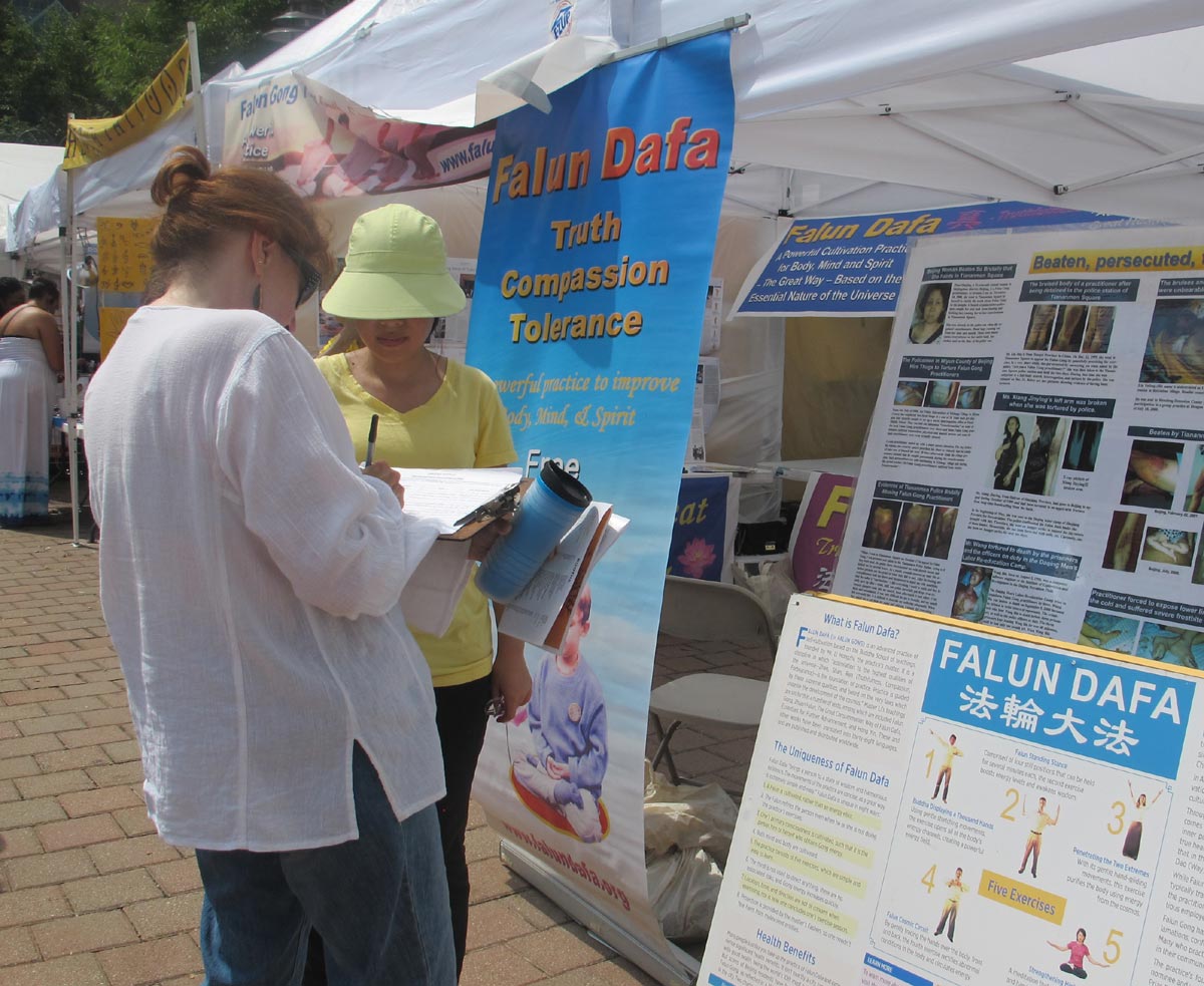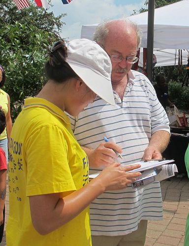 ![]() 肯塔基州世界节上,人们纷纷签名谴责中共活摘法轮功学员器官 |
