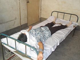 恶警李国平(时任看守所所长)、温凤山(看守所医生)、何寿青等四人把我按在一张单人病床上,两手铐在床的两侧,双脚还戴着十几斤的脚镣铐在床的一头,我根本动弹不了。然后孙平书(时任护士长)等给我输液。我已经绝食近10天了,按理说要输液应该是大输液瓶,可那个液体瓶子很小,是个250毫升的,而且里边的液体还是半瓶,我就产生了怀疑。心里求师父保护,坚决不要邪恶的任何药物。刚刚几分钟,我就象输液反应一样浑身哆嗦,我就大声喊道:“快点给我拔针、拔针、拔针!”然后我就哆嗦得说不成话了。恶警温凤山恶狠狠地说:“你装蒜!”我的几位家人一看我快不行了,也都说“快给她拔针”。在我家人强烈要求下,恶警才叫护士给我拔了针,又把我劫持回看守所关押。究竟给我输的液体里面加了什么药,是谁开的处方,我不知道,但孙平书等参与的护士应当知道。据业内人士说:医生开的处方,护士输液前是应当查看的。