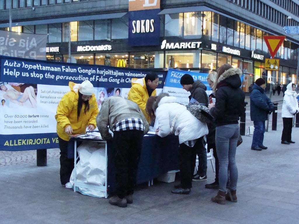 一月十一日在赫尔辛基火车站广场,法轮功学员如每个周末一样,举办反活摘器官征签,经常看到明白真相的民众主动支持法轮功的感人场面。