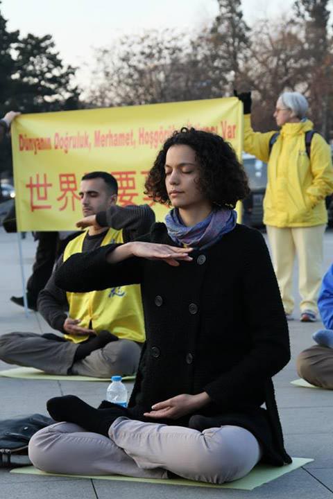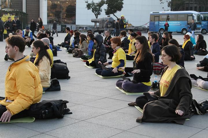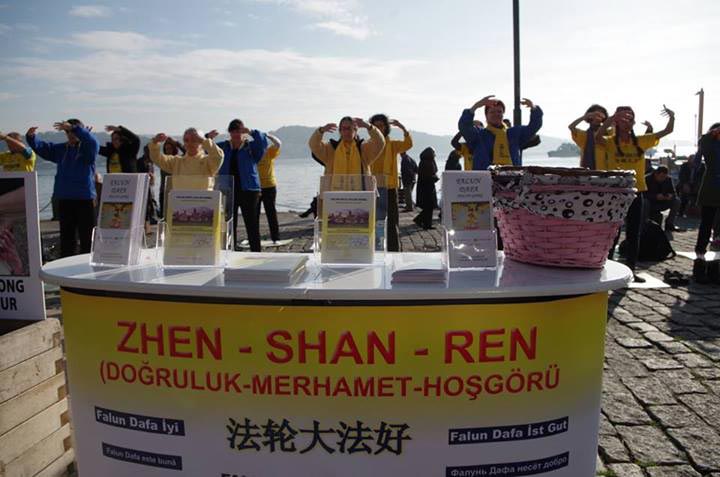 法会的前一天,一月十八日,学员们聚集在伊斯坦布尔最繁华的步行街地铁站(Beyoglu Subway)前,在舒缓悦耳的炼功音乐声中演示法轮功五套功法,向当地市民和游人展现法轮大法的美好,同时,揭露中共自一九九九年起至今对法轮功的残酷迫害,尤其是活摘法轮功学员器官牟利的暴行。整个下午的活动过程中,学员们散发了数千份传单,使很多民众了解了法轮功真相。