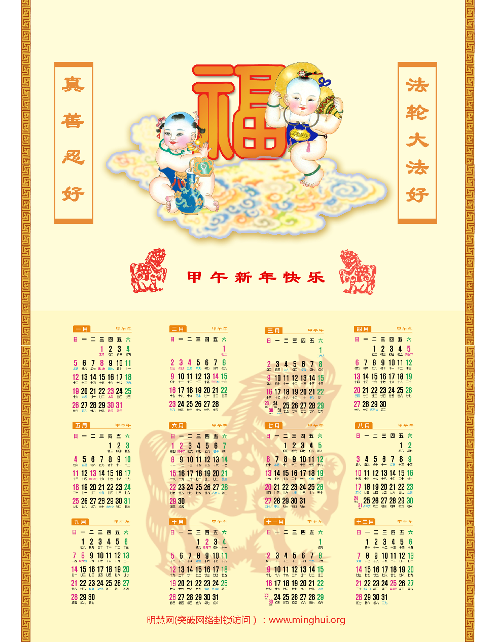 在本文的尾声,特别向国人和全球华人推荐明慧网呈现的精美年历,以供大家下载打印,悬挂在自家厅堂之上,也可送给他人。这样的年画,出自佛家修炼人之手,传统、吉祥、洁净、好看,伴随热气腾腾的初一饺子和驱邪除魔的爆竹声,她会给你带来甲午年满门祥瑞,好运连连。