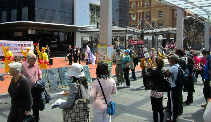 【明慧网二零一四年十月十二日】二零一四年十月十一日周六,奥克兰风和日丽。新西兰退出中共服务中心在市中心伊丽莎白广场举行集会,声援一亿八千万中国人退出中共的党、团、队组织(简称三退),同时向奥克兰当地民众传播法轮功反迫害真相。