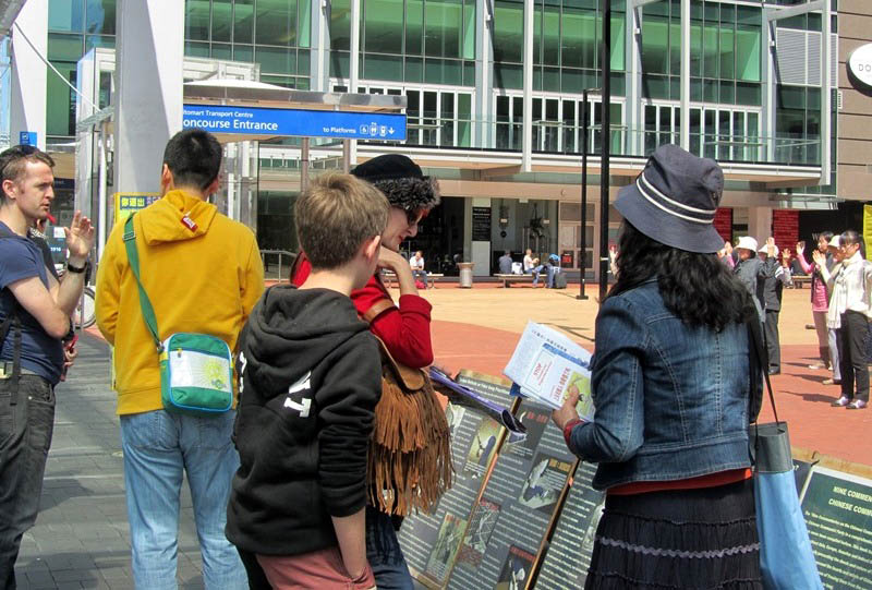 奥克兰市中心伊丽莎白广场上,路人观看声援三退集会并拍照