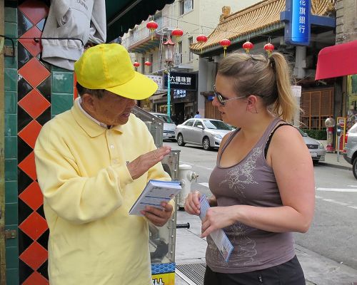 家在洛杉矶的牛先生来旧金山办事,正好赶上法轮功大游行。看着队伍,他很感兴趣,当沿途派发资料的法轮功学员告诉他要记住“法轮大法好”时,他说:“这个我记着。”谈到“真、善、忍”对他来说意味着什么,牛先生说:“我们做人嘛,尤其在国外,真和善,是人的本性,真、善实际上是人类社会最好的东西,忍我不太会。”说着他笑了起来。对于修炼真、善、忍的法轮功学员受到中共的迫害,牛先生认为,“共产党没有这个(指真和善),共产党糟糕的很,整个意识形态很糟糕。”