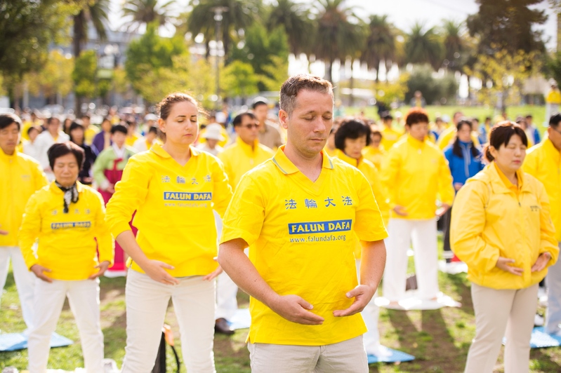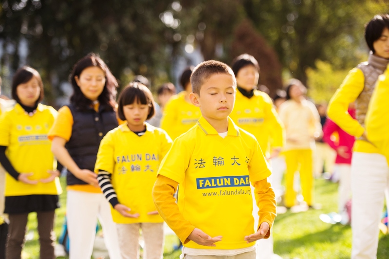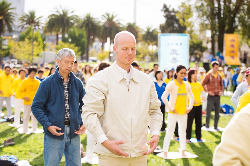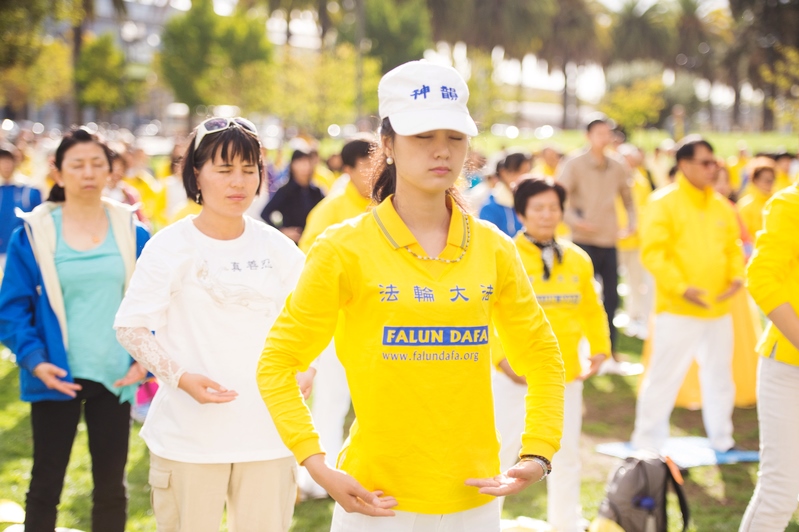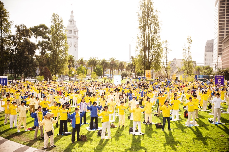 美国旧金山法轮大法修炼心得交流会前夕,四千多位法轮功学员从世界各地汇聚旧金山,在当地最富盛名的社区和旅游点附近的公园、市政厅及中国城,以大型炼功、游行与集会等形式展现“真、善、忍”的美好。