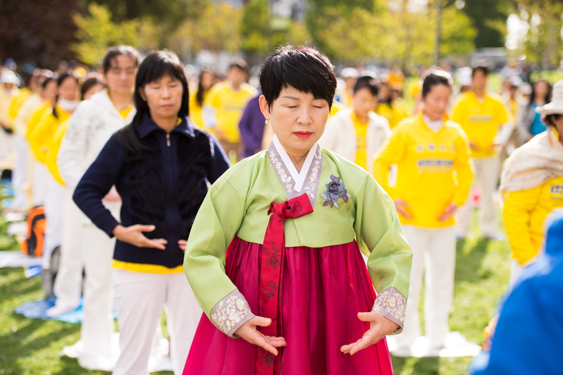 在宁静、悠扬的炼功音乐中,穿透云层的阳光将和煦与光明播撒在苏比尔曼公园的芳草地上静静打坐的一千五百多名不同年龄、不同族裔的炼功人身上,这场景在埃姆斯先生的心灵中定格成一幅光与色的永恒画面。