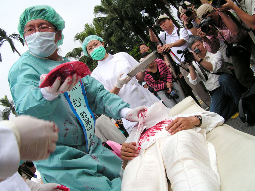 ![]() 图:法轮功学员在演示中共活摘器官 |