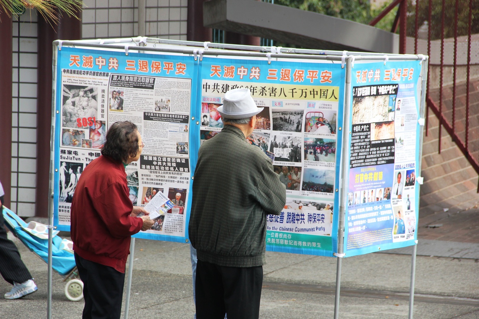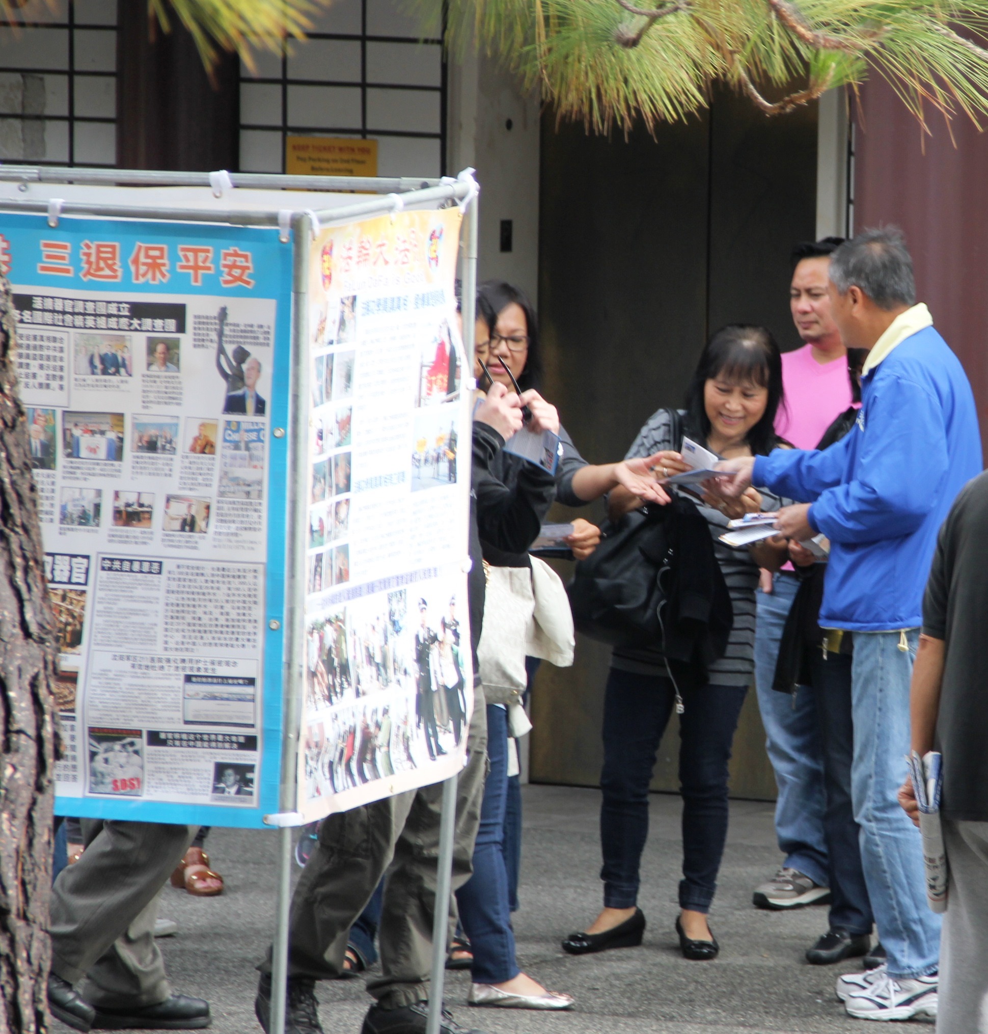 来自美国印第安纳州的法轮功学员王女士,在旧金山花园角公园街旁,递给一位二十多岁的华人女士一张传单,对方迟疑一下,接过传单接着前行,走了几步返回来对王女士说:“共产党为什么要迫害法轮功?你能给我讲讲吗?”