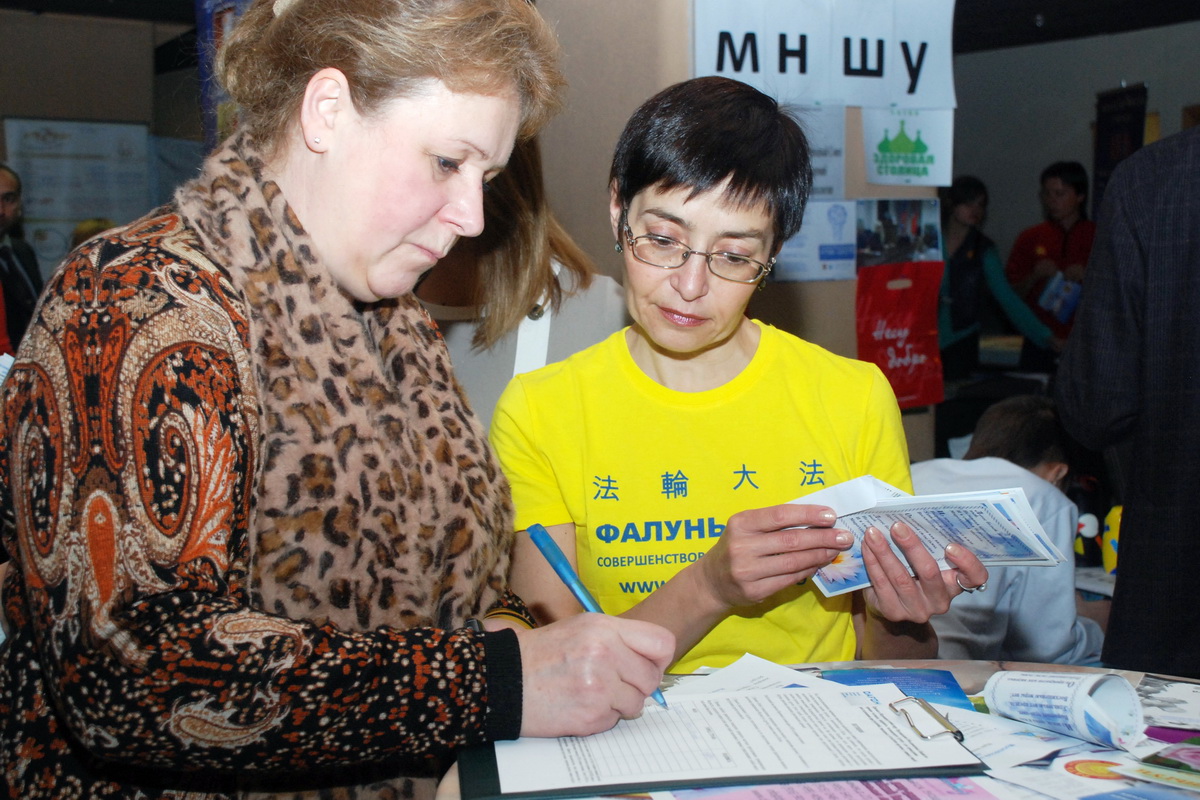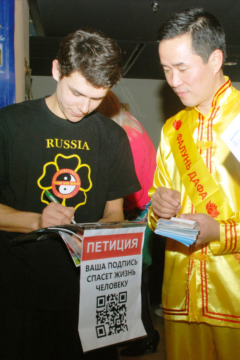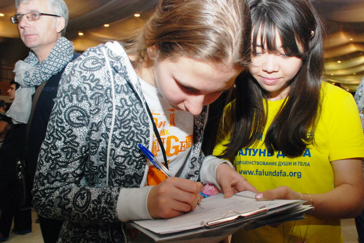 在教人们和孩子们做纸莲花的同时,莫斯科大法弟子向人们讲述着法轮功反迫害救人的故事。同时,学员们也带来了中国传统舞蹈,很多明白真相的家长和孩子们签名支持法轮功反迫害。