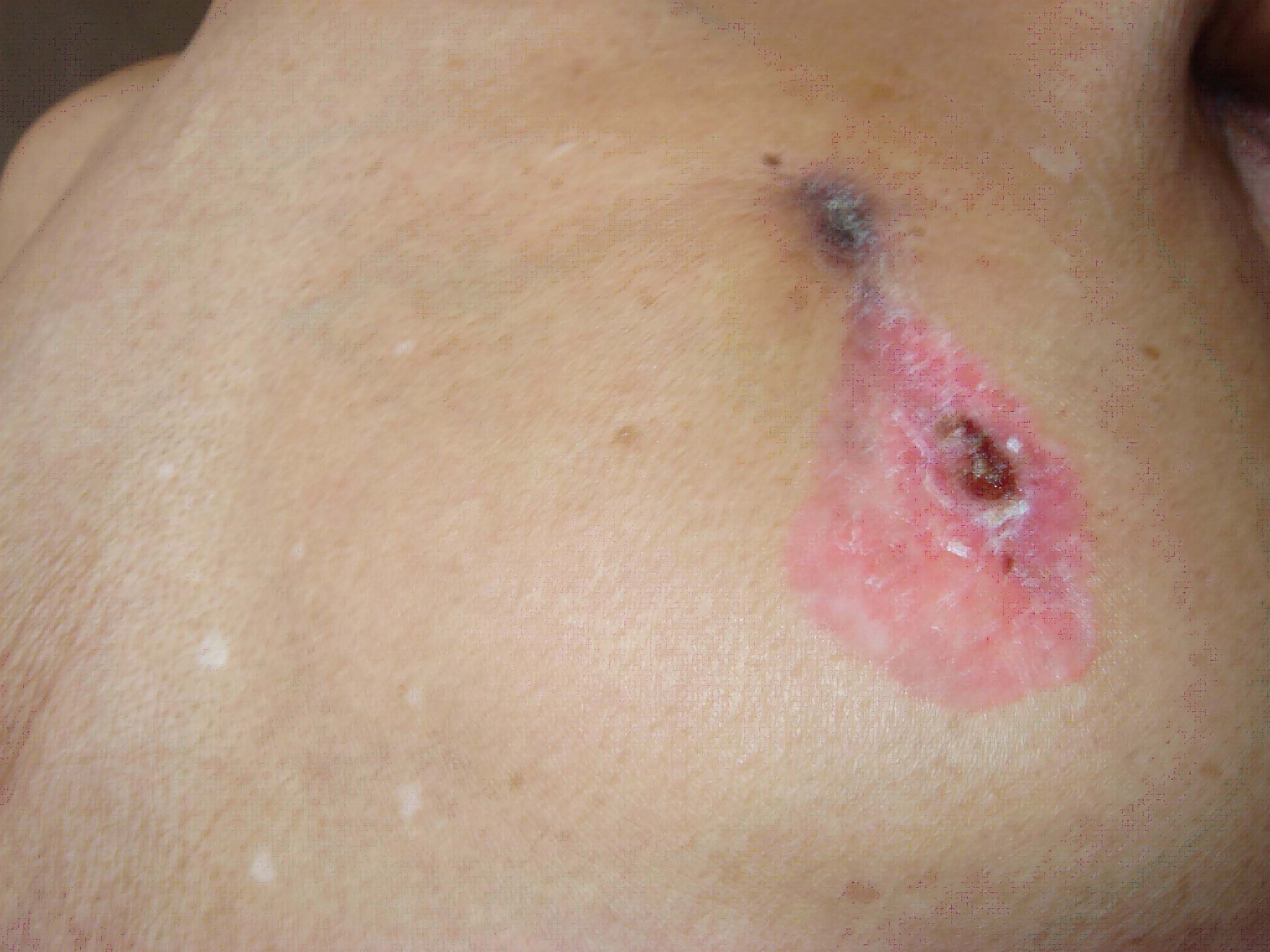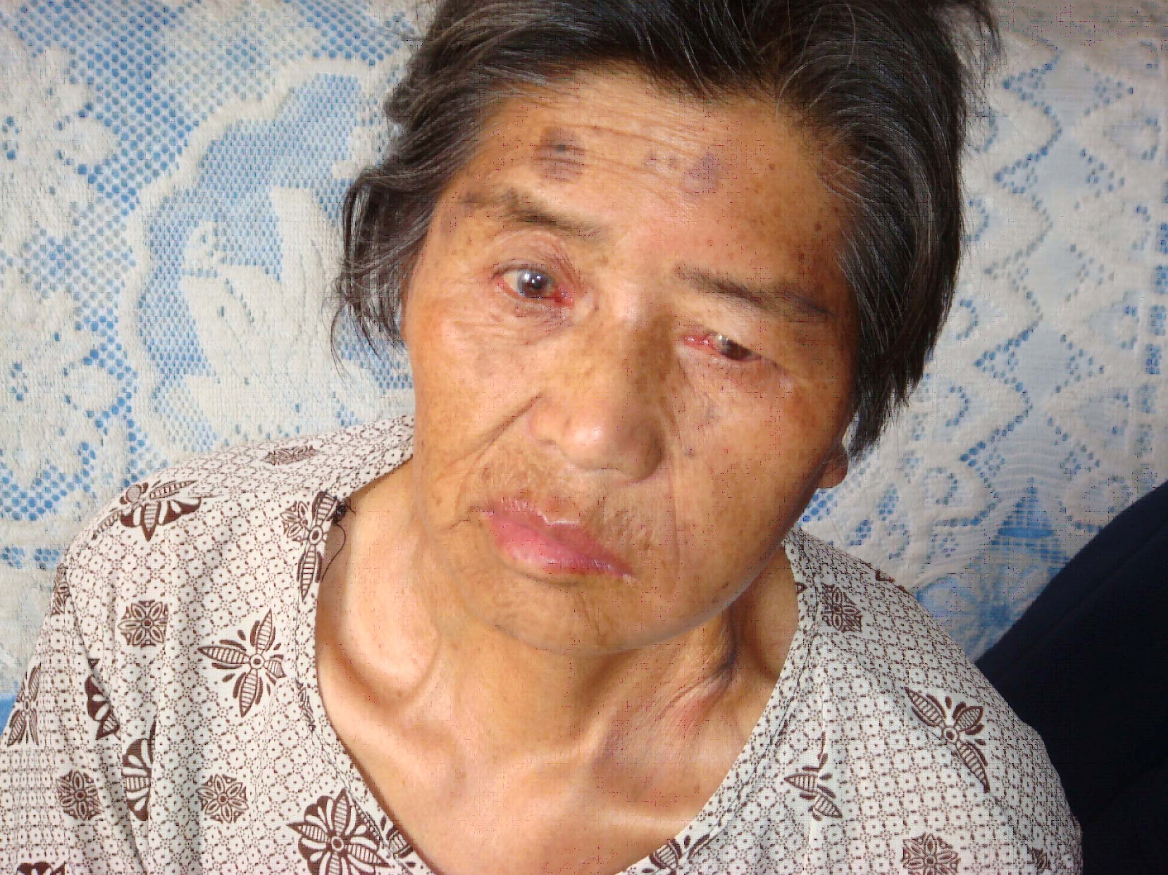 ![]() 赵永秀临终前四个月照片 | ![]() 赵永秀左侧乳房溃烂 乳头化掉 |