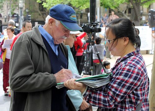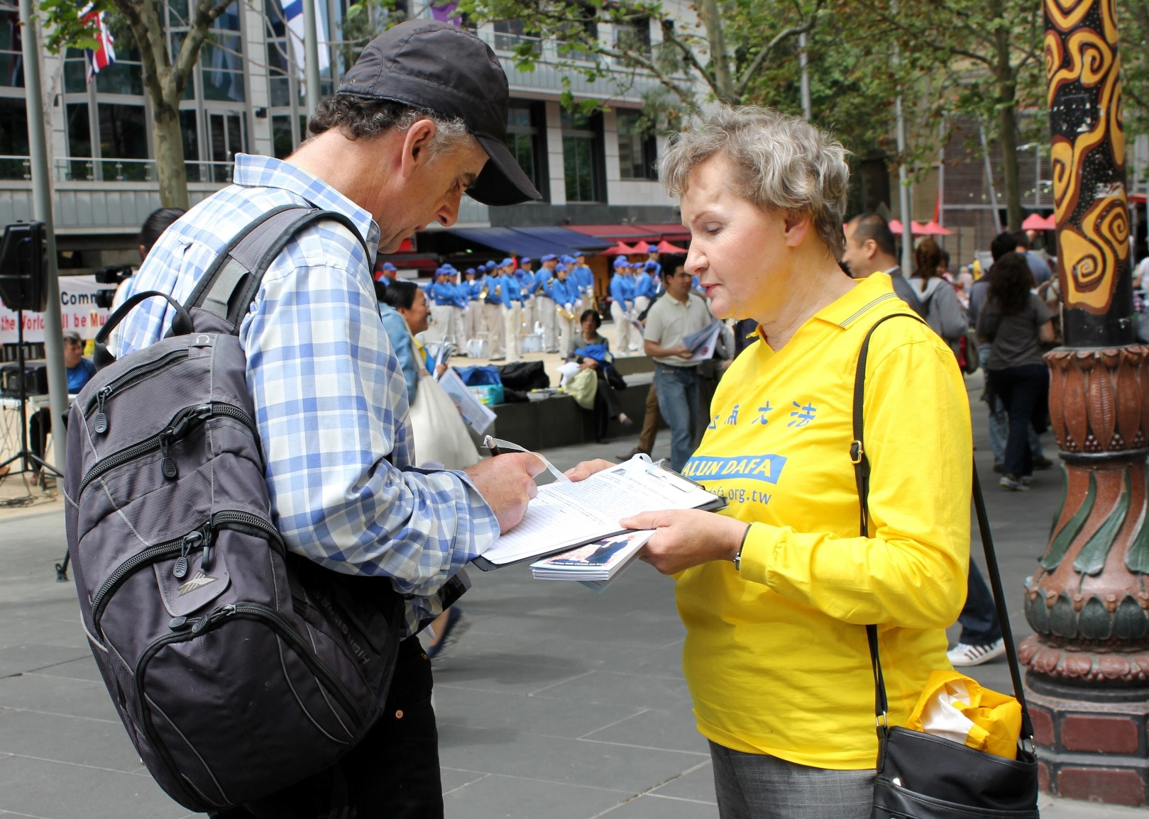 集会于下午十二点三十分开始,墨尔本法轮大法天国乐团首先演奏了《法轮大法好》、《法鼓法号震四方》、《法轮圣王》等曲目,响彻广场的鼓乐、雄壮的旋律令人振奋不已。听了嘉宾的发言,看了退党义工发放的资料,明白真相后的世人纷纷签名,呼吁制止迫害
