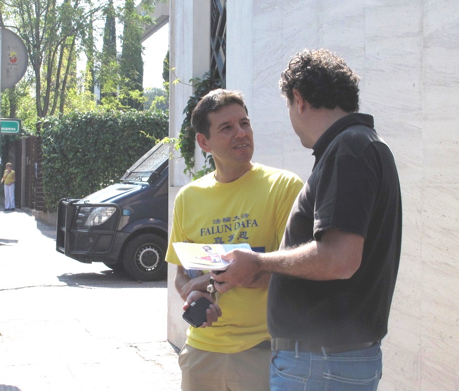 ![]() 图4: 西班牙国家大报记者在中使馆前采访法轮功学员 |