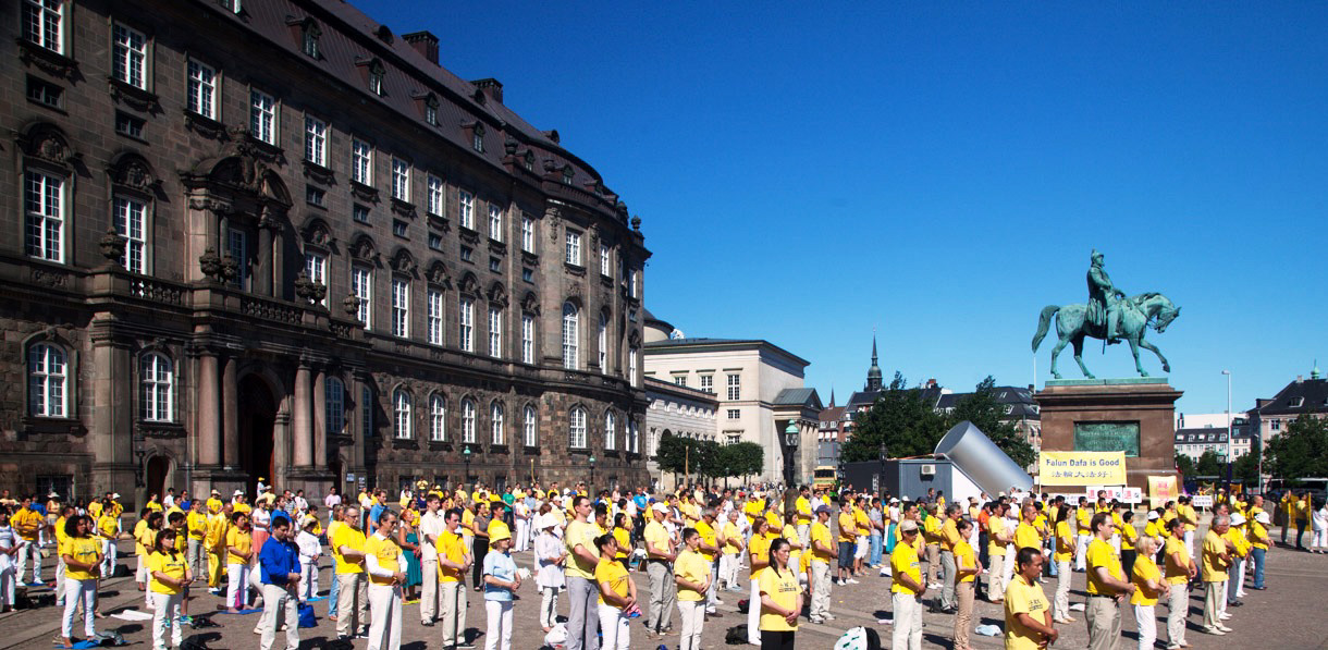 ![]() 图2:二零一三年夏,欧洲法会期间法轮功学员集体炼功 |