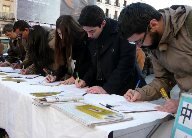 ![]() 图1:西班牙民众在马德里太阳门广场踊跃签名,声援法轮功反中共活摘器官暴行 |