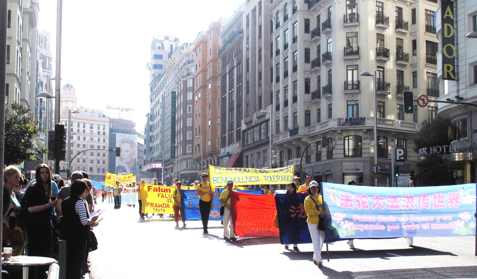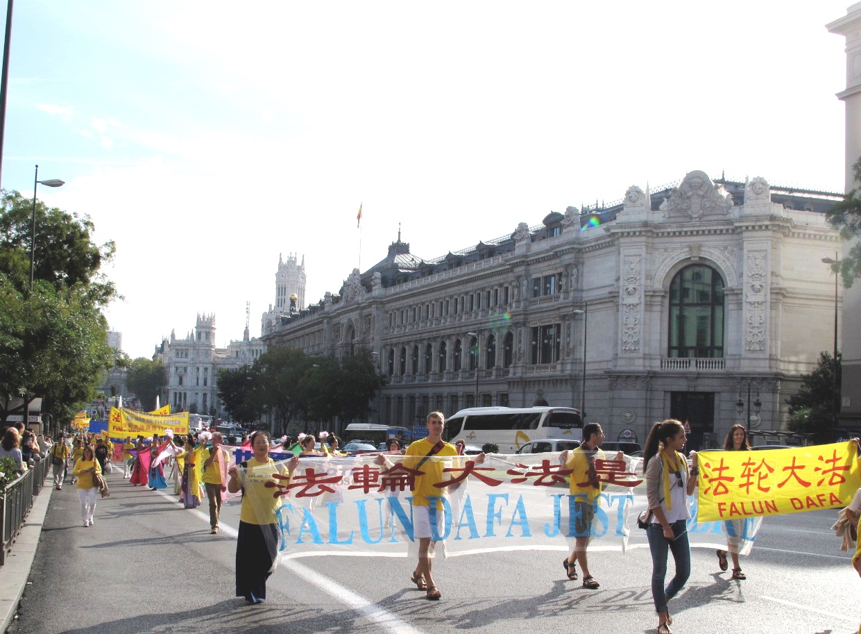 阵容庞大的法轮功游行队伍,在天国乐团引领下,从独立广场(Plaza de la Independencia),经过近五公里的城市主要街道,最后到达马德里市中心的太阳门广场(Puerta del Sol)。