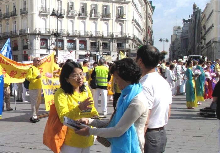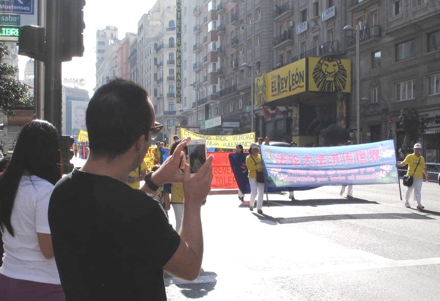 星期六上午十一点开始的法轮功大游行,途径马德里的很多重要路段和广场,游行队伍历时近三小时后到达位于马德里市中心的太阳门广场(Puerta del Sol),并在那里接着举行大规模集会。很多住在马德里的华人和来自中国大陆的游客都被声势浩大的游行集会所吸引,停下脚步认真观看,不少人对着游行队伍和横幅拍摄,有的还跟着队伍走上很长一段路。