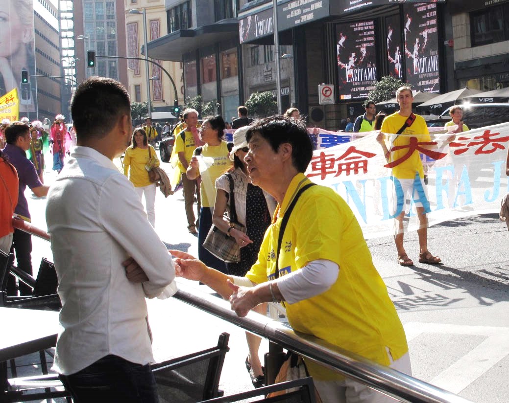 法轮功学员欣喜地发现,看到由天国乐团引领的浩浩荡荡的法轮功游行队伍,加上游行队伍让法轮功真相信息历历在目,华人观众脸上不友好的表情少了,更多地代之以好奇、惊喜、思索和友善。随着游行队伍发放法轮功真相资料和手工莲花的学员每当看到中国人面孔,往往会高兴地走上前去递出真相传单,大多数人都接过传单,有些人在游行队伍经过之后仍站在原地认真阅读接过的资料。无论是在游行开始前、游行过程中还是在游行后的集会现场,都有法轮功学员抓紧机会向自己遇到的可贵中国人深入讲真相和劝三退。