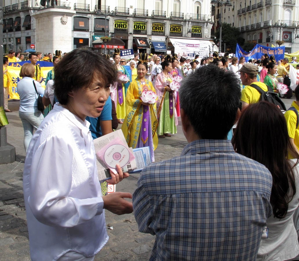 来自英国剑桥的法轮功学员周女士参加了十月四日的马德里法轮功大游行,游行出发前她遇到了一组从中国北京来的游客。长期在剑桥向中国学生及游客讲真相劝三退的周大姐立即上前和她们对话,讲真相劝退,结果有一位男士、两位女士同意退出邪党组织。