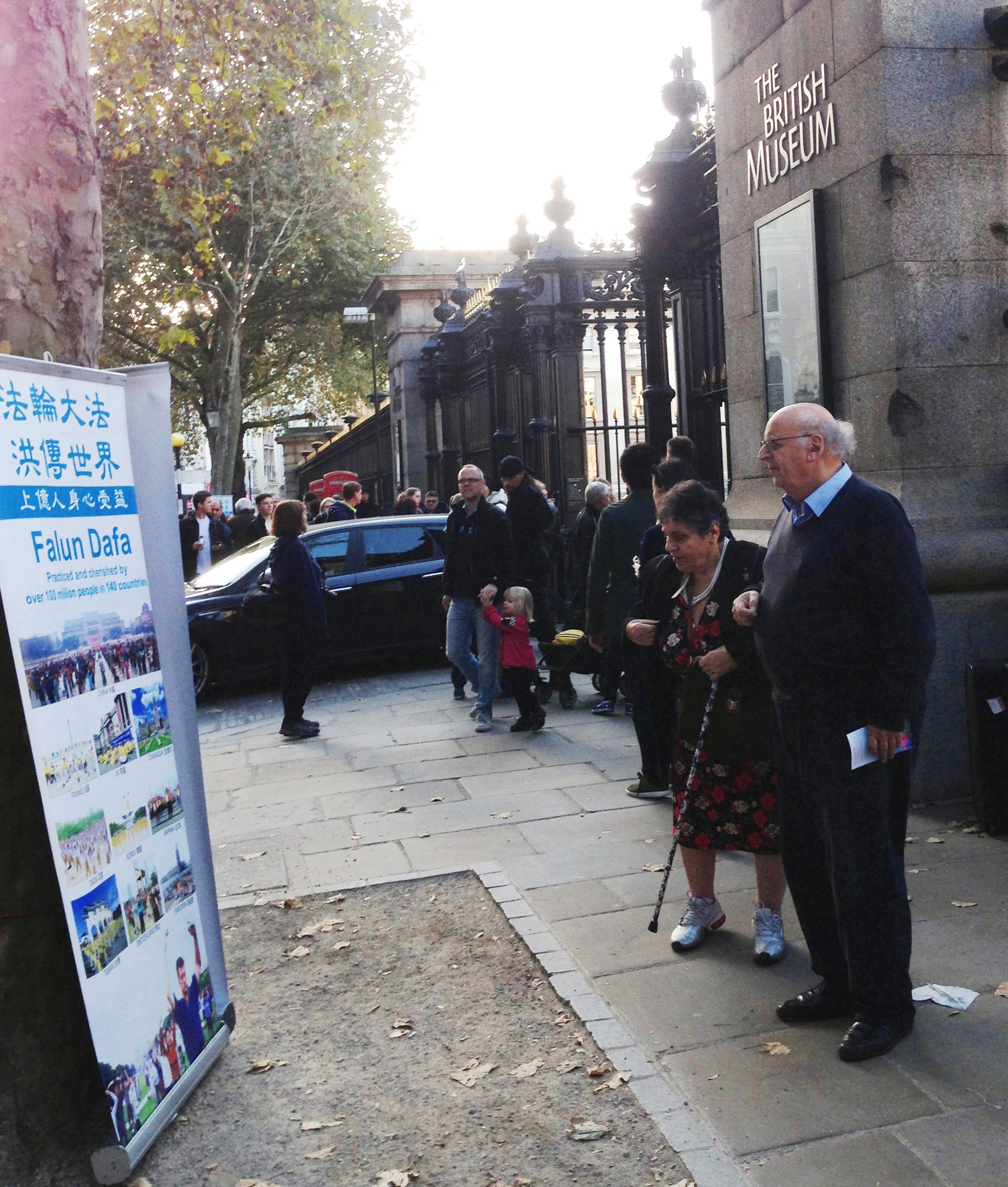 英国法轮功学员近四个月来每天在大英博物馆门口展示法轮功真相、面对面讲真相劝三退,把这个收藏众多中国历史文物和其它辉煌人类文化遗产的博物馆,变成了一个新的了解法轮功真相的世界窗口,更成为宝贵的中国人在海外三退(自愿退出中共邪党及其附属组织共青团和少先队)保平安的有缘福地。