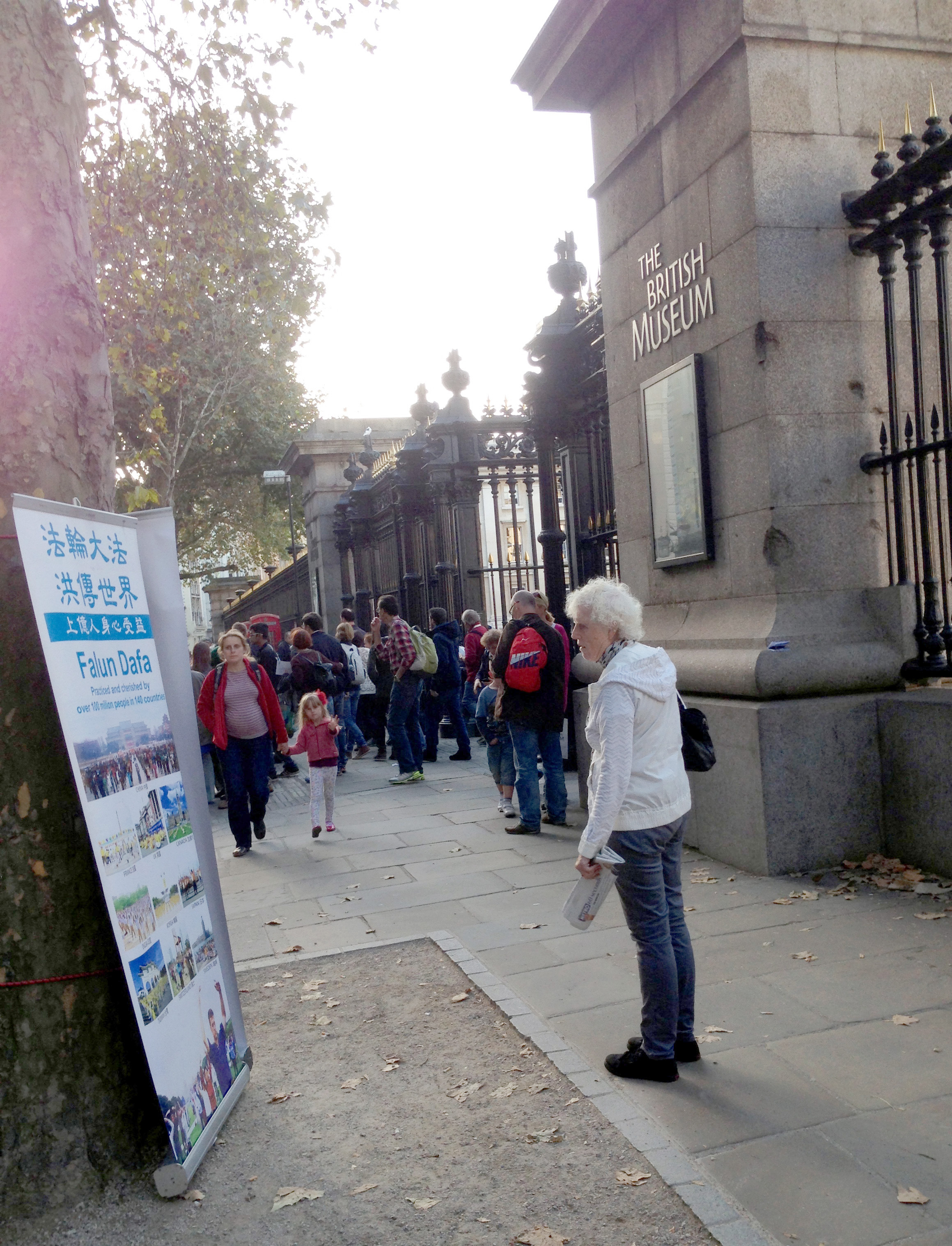 大英博物馆(British Museum)正门是个大铁栅栏门,四个月来,每天下午都会有法轮功学员站在这个大门口向进出游客发英文法轮功真相传单、中文真相传单、小册子和报纸,有时一天发出约两千张英文传单。