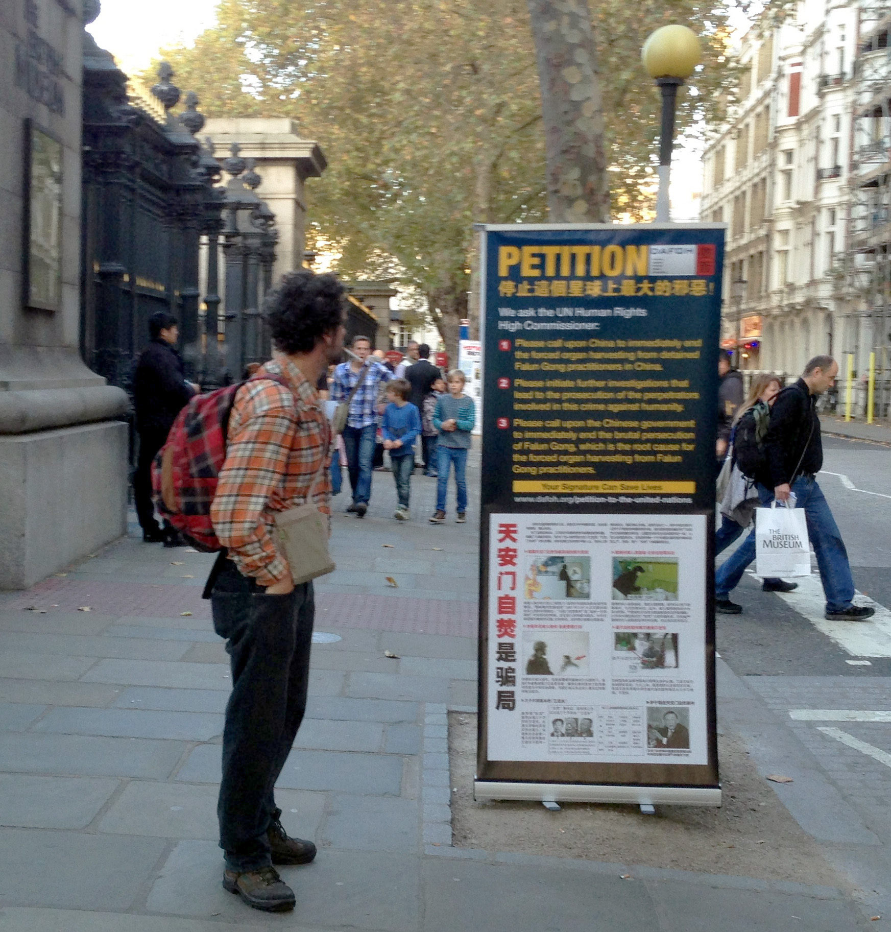 ![]() 图4:访问及路过大英博物馆(British Museum)的游客驻足观看法轮功真相展板 |