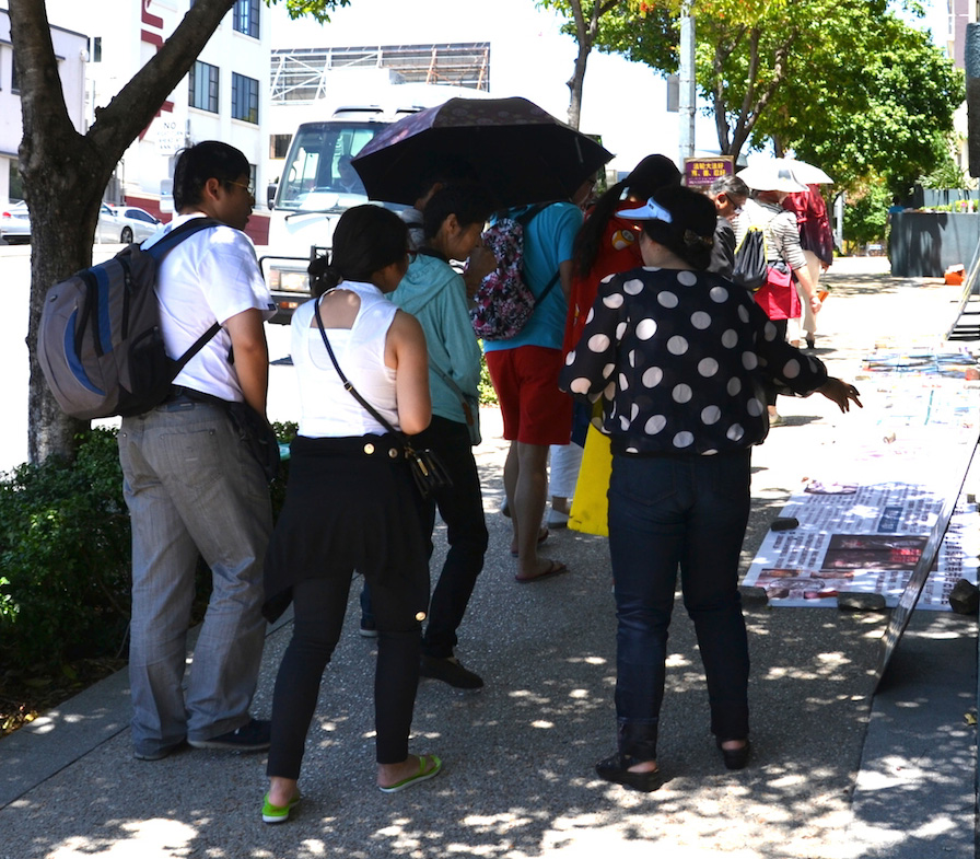 中国城热闹的街道旁,法轮功学员们静静地举着横幅,醒目的标语“法办江泽民、法办罗干、法办刘京、法办周永康”、“严厉谴责和制止中共活摘人体器官反人类暴行”、“要做中华儿女,不做马列子孙”等,让到访的中国游客们很是震惊,有人目瞪口呆地看着,也有很多人连忙拿出相机照相。