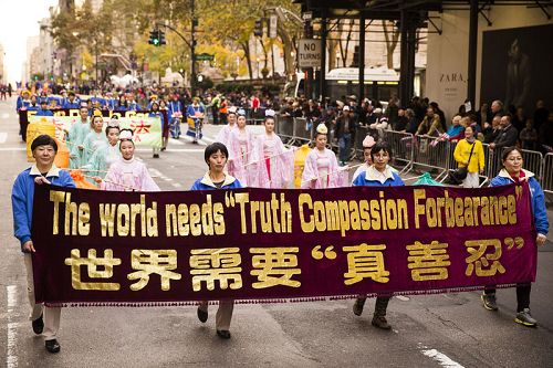 法轮功队伍以美丽的中英文横幅“法轮大法”、“世界需要真善忍”开道,西方学员手捧英文版《转法轮》书模型紧随其后。身着唐装的仕女手提写着“真善忍”字样的灯笼缓缓前行,祥和的炼功队伍展示着法轮功功法,振奋人心的腰鼓传递着金色的希望。