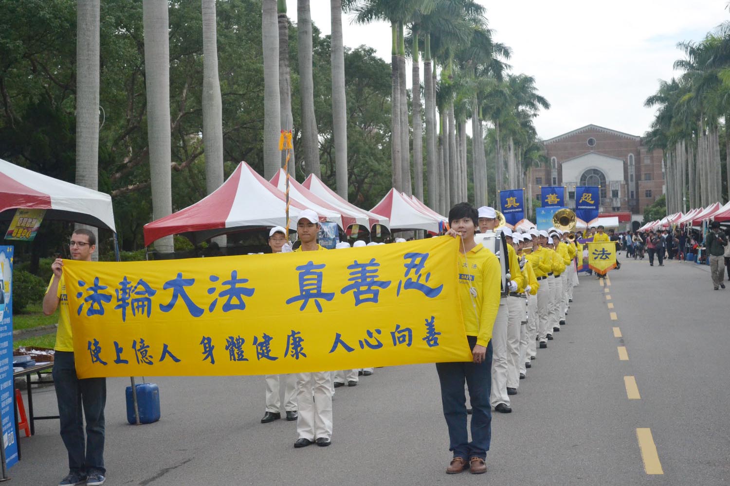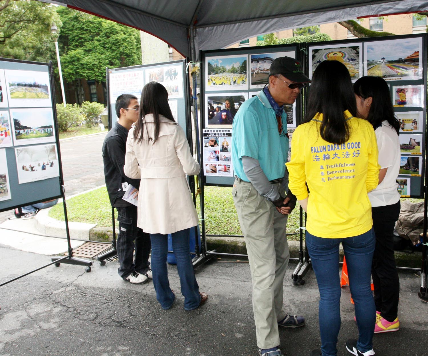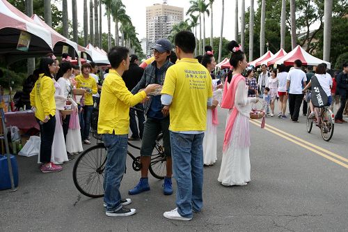 法轮功弘法摊位询问度很高,有许多民众、学生接下法轮功青年学子所传递的真相资料,展架上挂着法轮功的美好与弘传全世界、揭露迫害的真相图片,也有许多外国人士好奇前来询问。