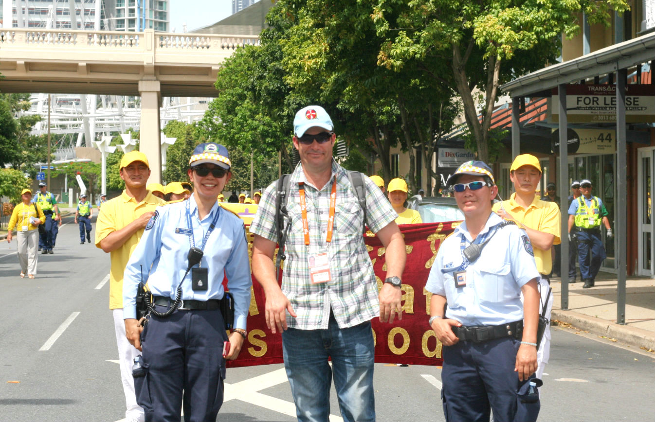 在乔治国王广场(King George Square)横幅点上值勤一整天的一位中年警察对学员说,他很少看到这样安静、平和的抗议活动。深受感动的这名警官和每位在场的法轮功学员一一握手,感谢和夸赞他们的杰出表现。