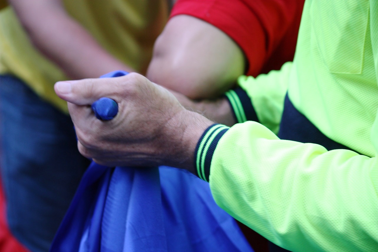 法轮功学员、悉尼市民约翰•戴勒先生(John Deller)下班正好路过暴徒冲击法轮功学员活动的现场。一个穿红衣服的亲共团体成员用胳膊肘硬压戴勒先生紧拽着法轮功横幅的手,想抢下蓝色的法轮功横幅。这样拉扯了几分钟之后,几个中共官员来到现场,唆使也刚来到现场的警察把法轮功学员和横幅挪至另一边去,亲共流氓团体和血旗占据了法轮功学员原本申请获批准举办活动的地角。