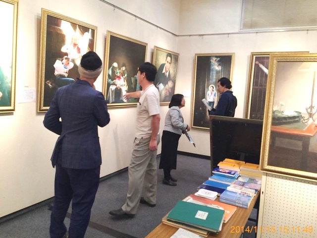 十一月十一日是国际美术展开展的第一天,下午两点半,还差半小时才到预定的开展时间,一名叫石原的中年男士就迫不及待的走进了展厅,因为工作人员不好意思再拒绝(第二次)他了,就提前开始给他讲解。