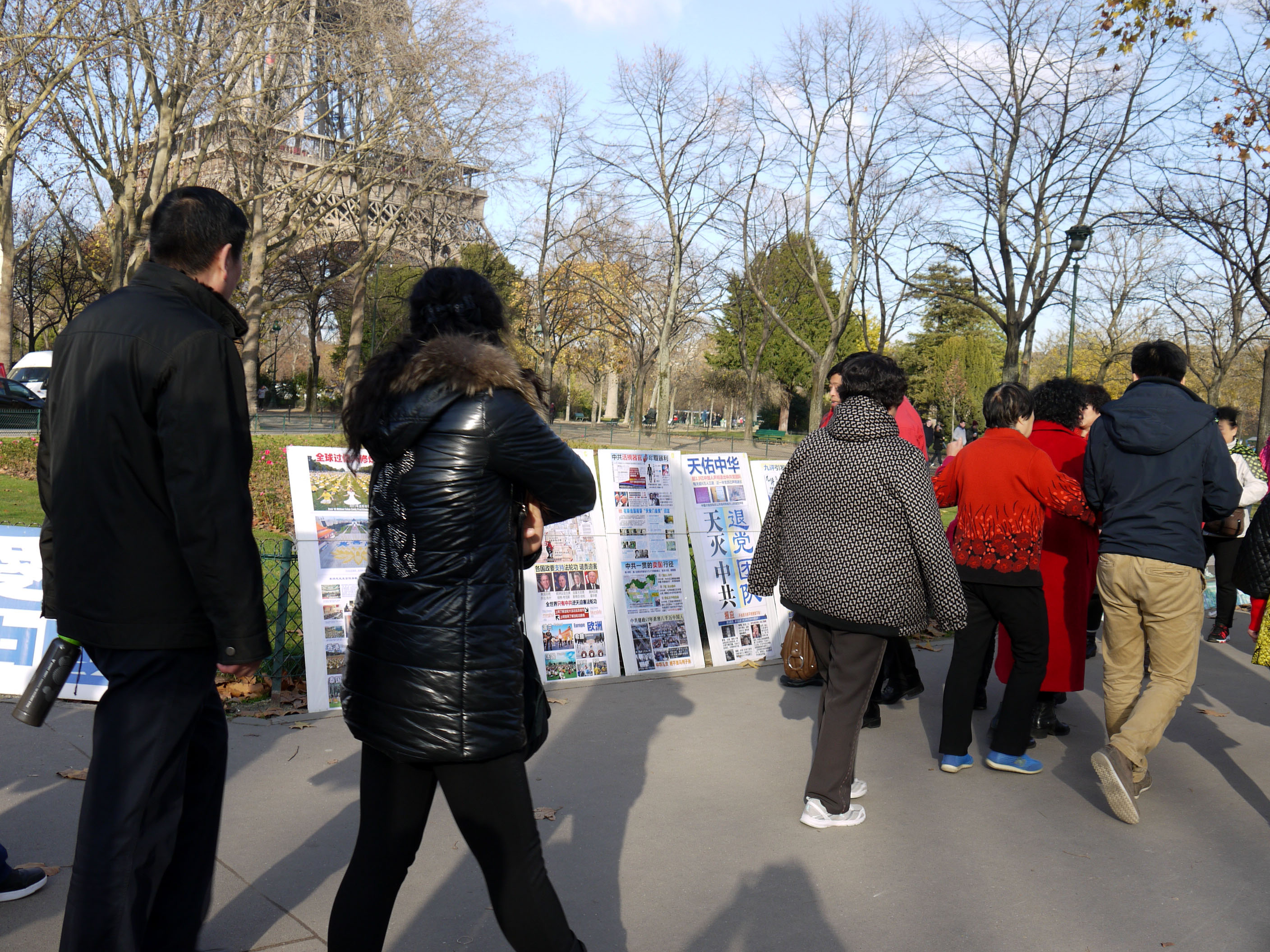 ![]() 图1-3:成群结队的中国游客路过巴黎铁塔下的法轮功真相点 |