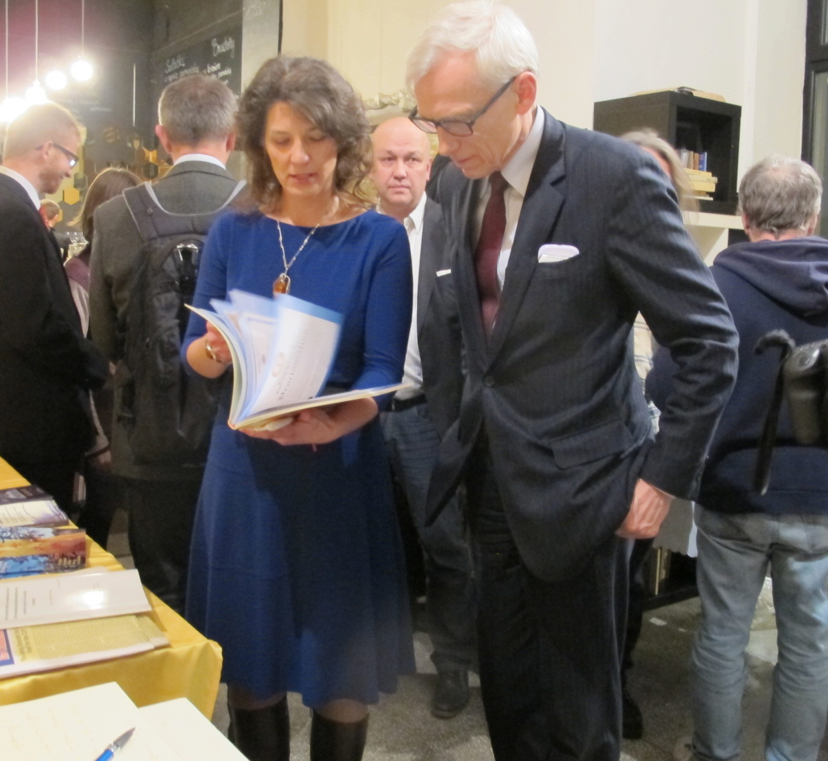 ![]() Marcin Święcicki议员观看和倾听对真善忍国际美展画册的介绍 |