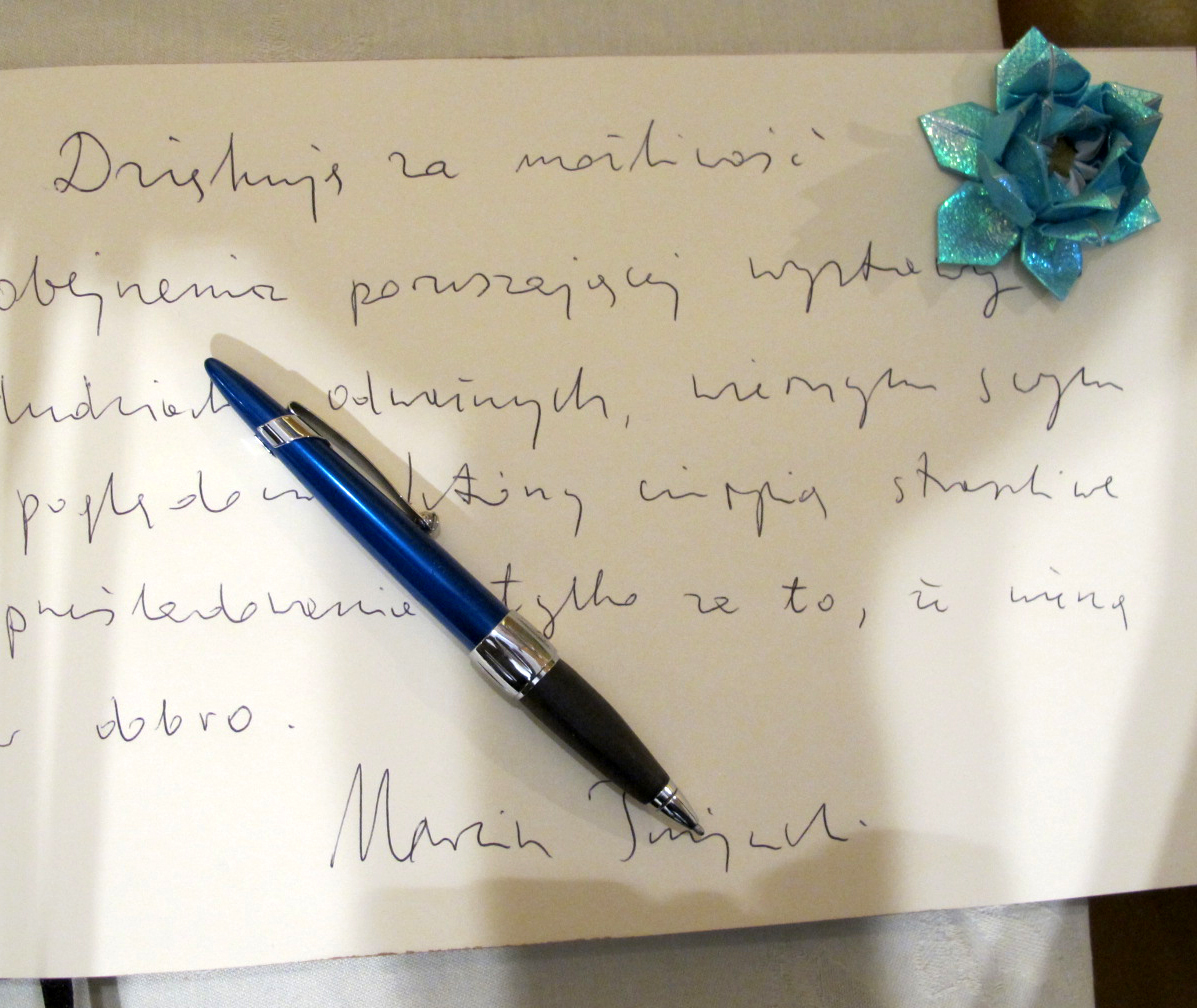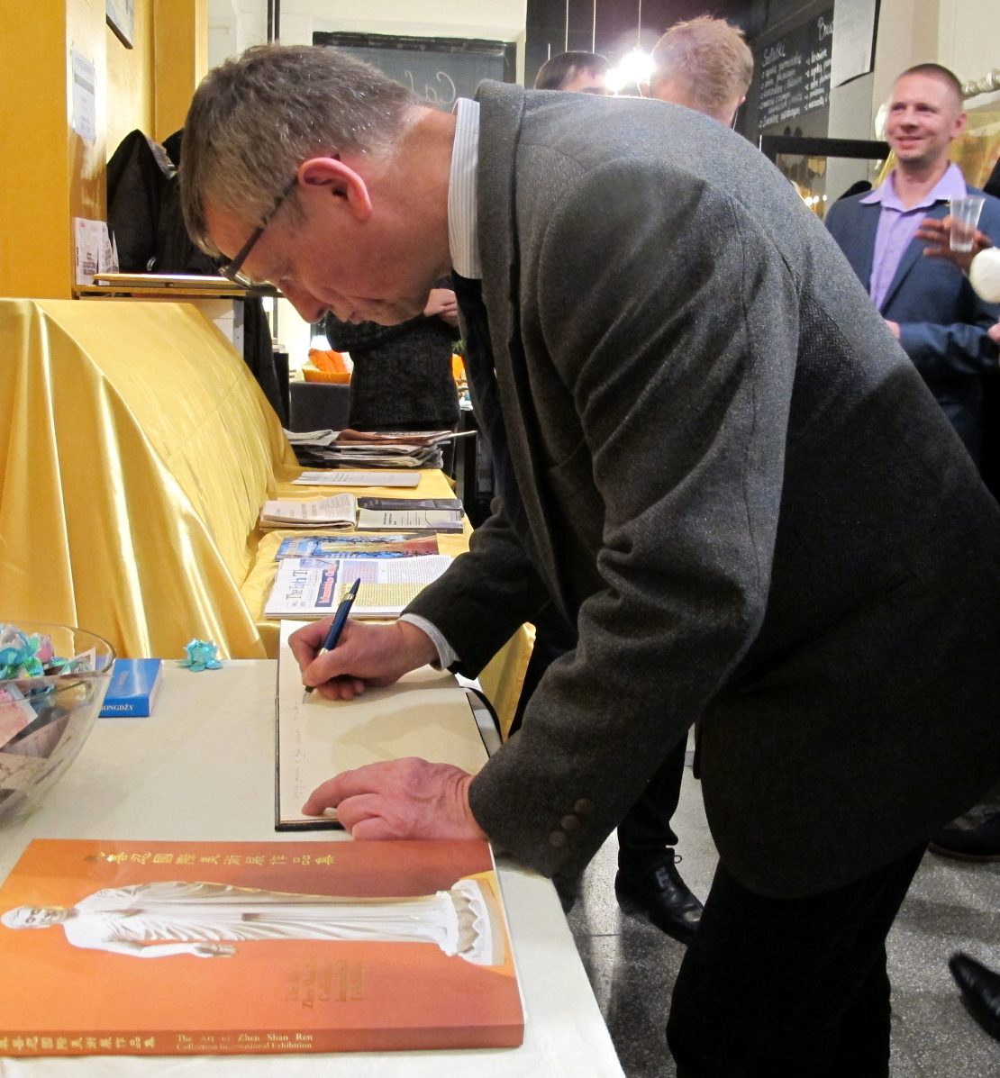 Marcin Święcicki先生临走时在留言簿上还写道:“谢谢能有机会看到这么动人的画展,它讲述了有那样一些人遭受到如此可怕的迫害,只因信仰美好的理念和忠实自己的观点。”