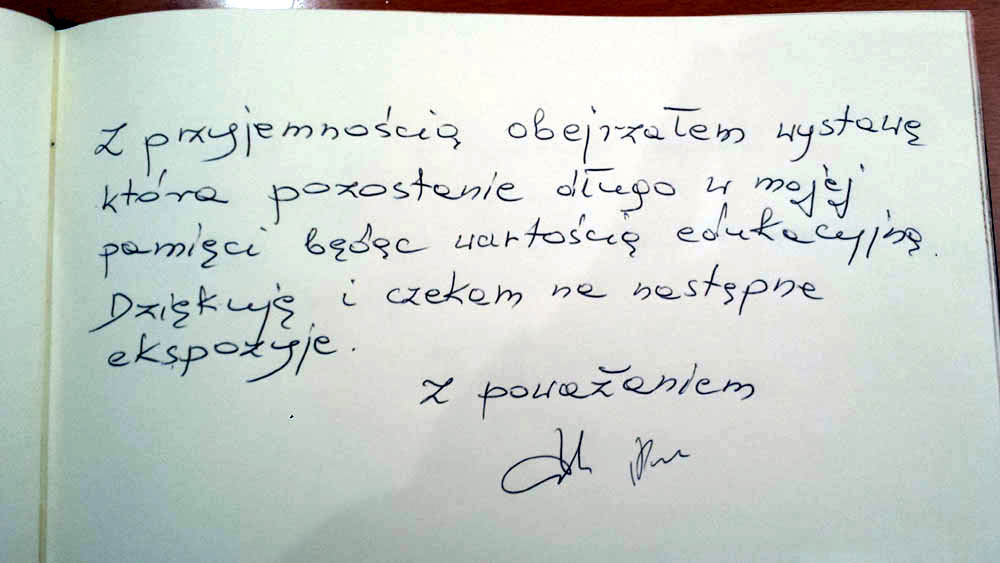 ![]() Marcin Święcicki先生留言:“谢谢能有机会看到这么动人的画展,它讲述了有那样一些人遭受到如此可怕的迫害,只因信仰美好的理念和忠实自己的观点。” |