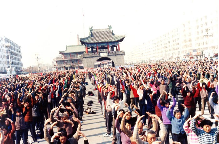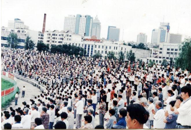 一九九九年七月前,哈尔滨法轮功学员集体炼功场面