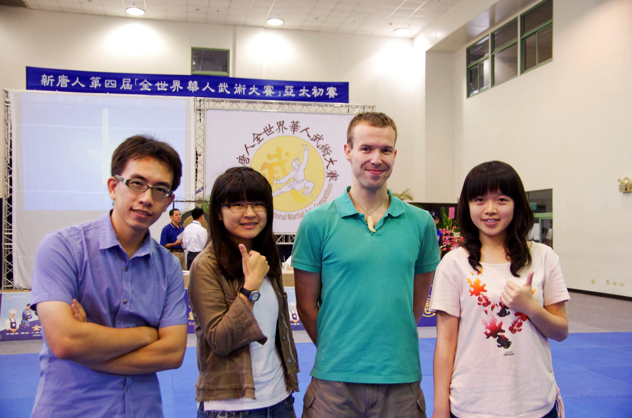 ![]() 张嘉升(左一)与朋友参观新唐人武术大赛 |