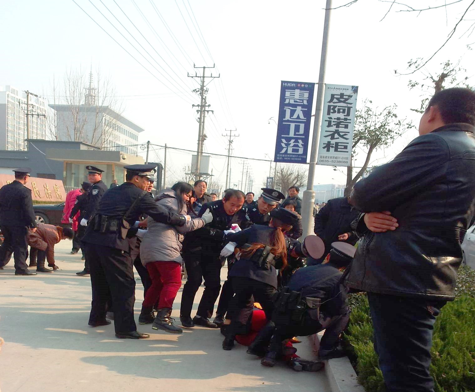 ![]() 第一次,三个警察把金勇大姐按倒在地企图强抢手机未遂。 |