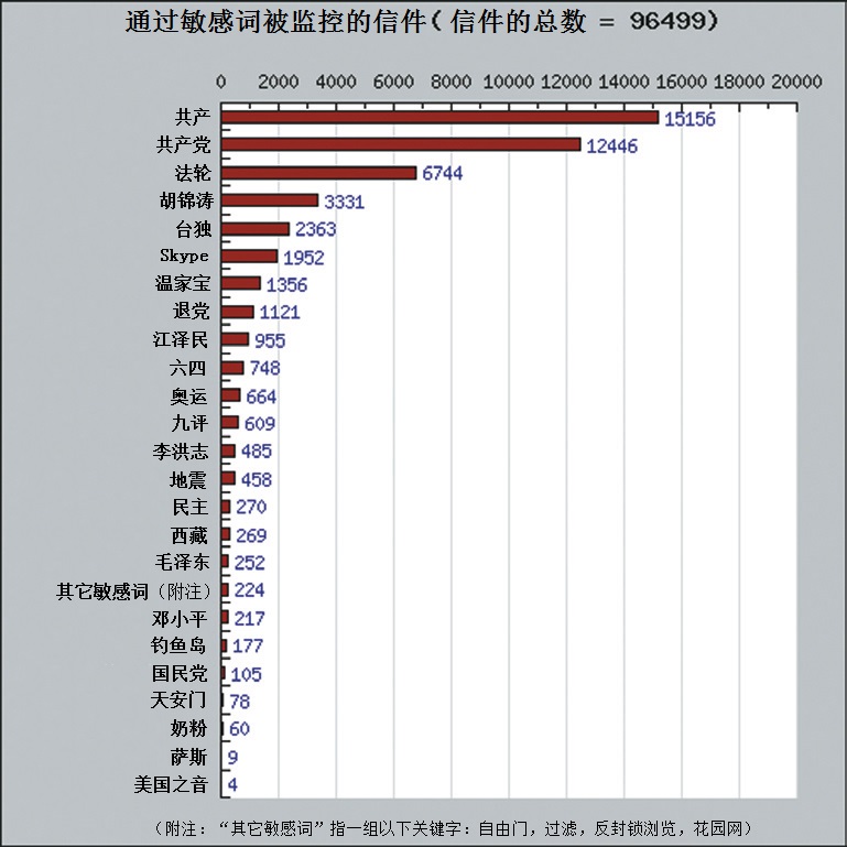 监控内容包括与“敏感”问题有关的词语,例如退党、法轮功等。另外,民主、地震以及奶粉等当时热门词汇也在监控的范围内。