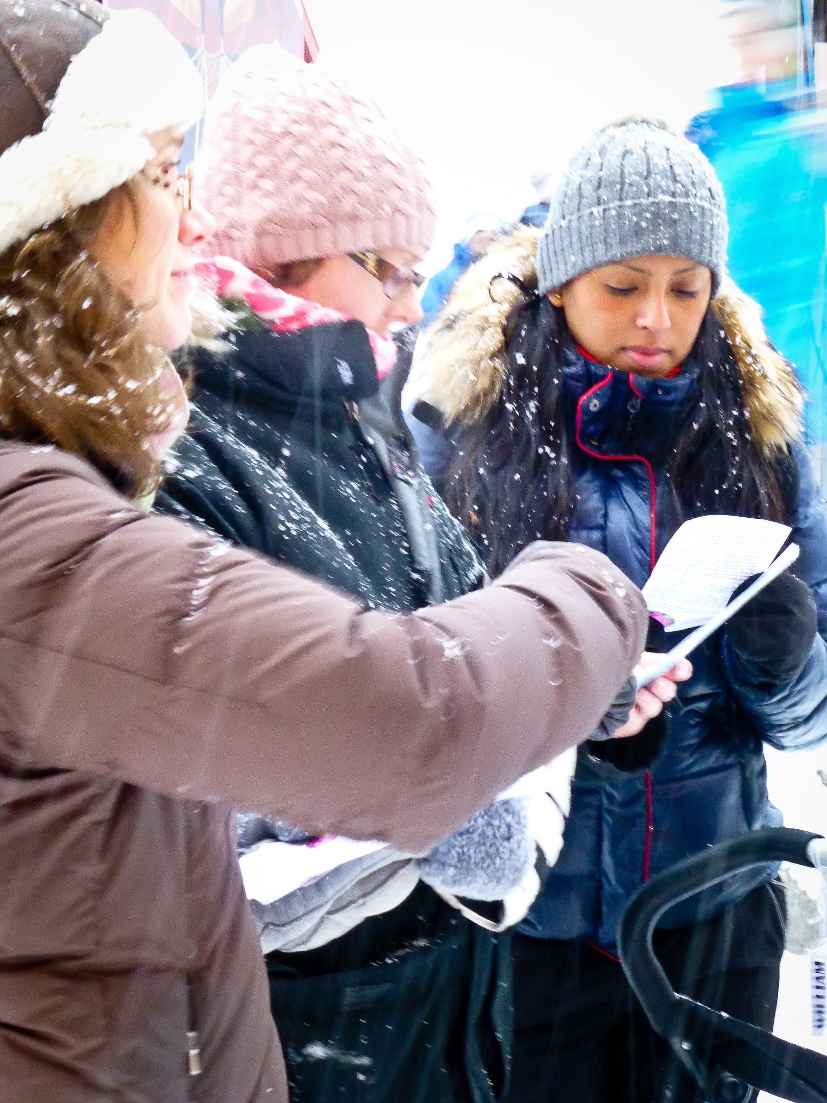 二月一日傍晚,学员在冰雪拍积及鹿皮装饰的露天的舞台上介绍法轮功,讲话的时间原本是规定在五分钟之内,但是听众们看到祥和的功法,不自觉站起来跟着学炼,台前的主持人也跟着台上的学员炼了起来,整个场面很感人。后来台上的学员邀请大家一起学习第一套功法,所有的听众都站起来认真的学炼功法,连台前的主持人也跟着学完第一套功法。