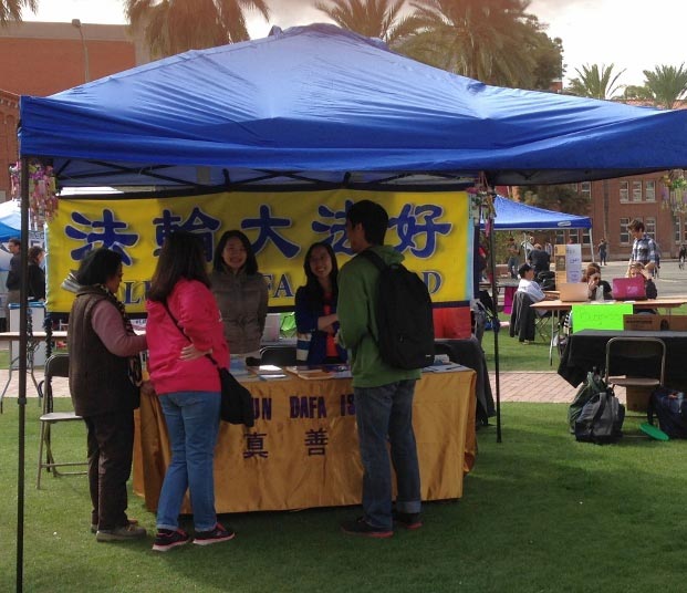 ![]() 图:法轮功学员在亚利桑那大学的社团博览会上,设立摊位,传播法轮功真相。 |