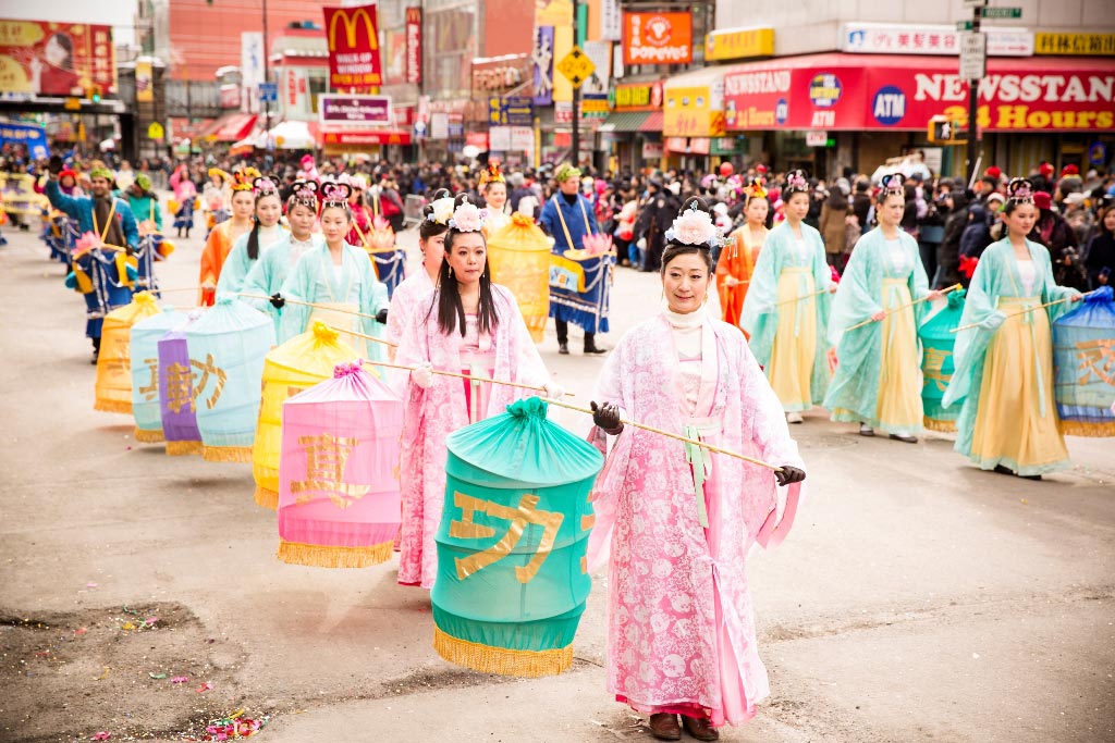 “九天仙女下凡尘”,身穿仙女装的法轮功学员手提“法轮功”、“真善忍”灯笼款款前行,把祝福送到千家万户。摇旱船的中西方学员载着满满的欢乐,给大家贺岁。