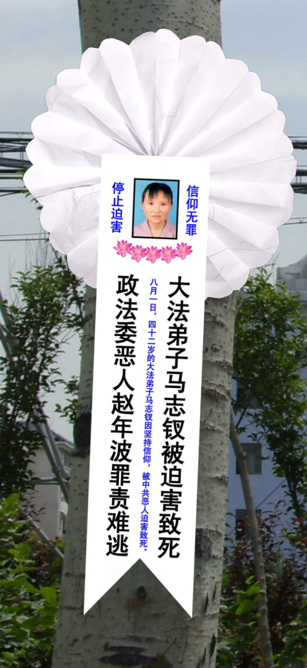 马志钗女士被迫害致死的消息在明慧网曝光后,济源市法轮功学员们张贴小白花和挽联悼念她,揭露中共恶人恶警的残忍暴行。中共恶人恶警非常恐惧,层层布置,命令每天晚上九点巡逻,见到小白花就摘掉,如果摘不掉,在树上的把树锯掉,在墙上的把墙挖坑。有的法轮功学员因此被绑架到看守所。
