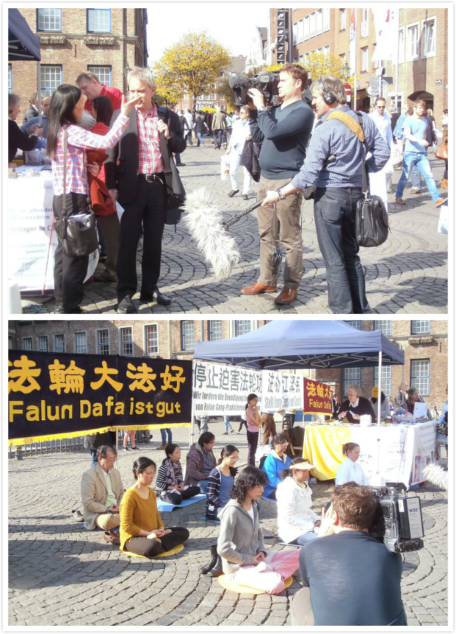 下午,西部德国电视台的记者组专程来到法轮功学员的集会现场,对法轮功学员的整个和平集会现场,包括功法展示、征集签名和学员演讲等做了全面的电视采访。之后还对法轮功学员拉尔夫·格罗诺先生和徐沛女士分别做了电视采访。有关电视采访报道已于二十九日当天晚间在WDR北威州地方频道,习近平访问杜赛尔多夫专题下播出,在这个三分钟的电视报道中,有关法轮功学员集会的报道占时近一分钟。