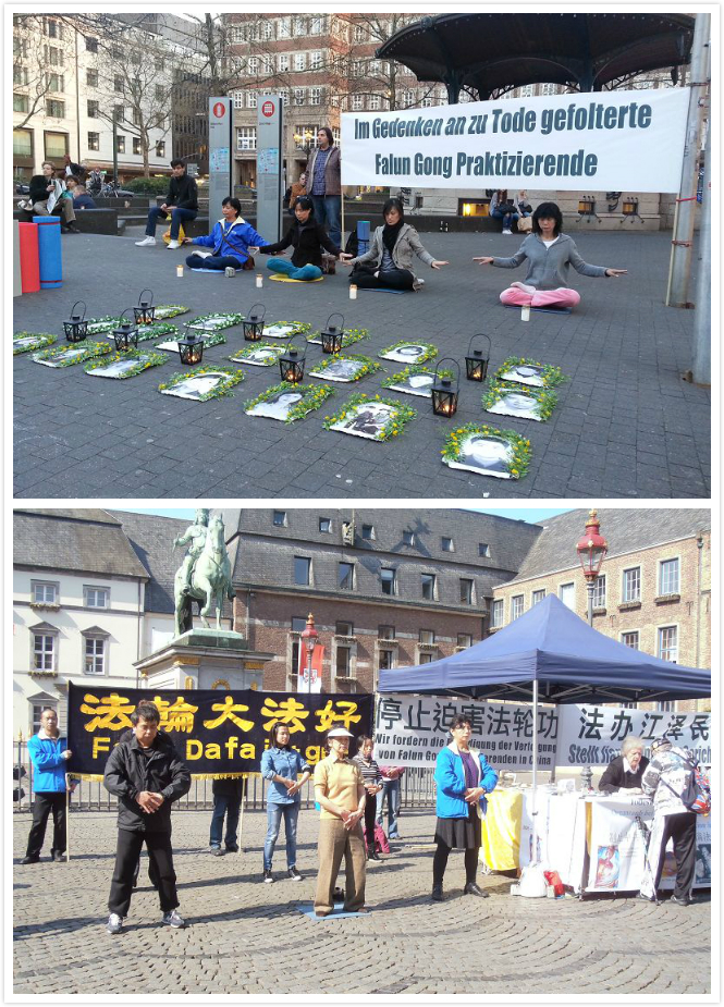 三月二十九日,习近平造访杜赛尔多夫之际,北威州法轮功学员在杜塞尔多夫市政厅前广场和国王大道旁的海涅广场,举行大型集会和烛光守夜,呼吁法办迫害法轮功的元凶江泽民及其同伙。